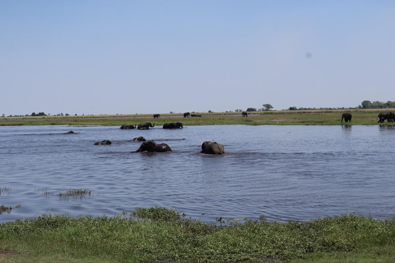 宿泊したビクトリアフォールズレインボーホテルを出て国境を越えてボツワナのカサネに入り、チョベ川沿いにあるチョベマリーナロッジに、午前中は4WDの車でドライブサファリを楽しみました、象、カバ、キリンなど見ることが出来ました、動物がいるとドライバーが停車して見たり、写真を撮ったりする時間を与えてくれました、ドライブサファリの後はチョベマリーナロッジでブッフェの昼食をとりました、午後はボートサファリを楽しみました、ナミビアとボツワナの国境を流れるチョベ川を航行、動物や鳥を見ながらの移動、ナミビア側領土内も航行しました。
