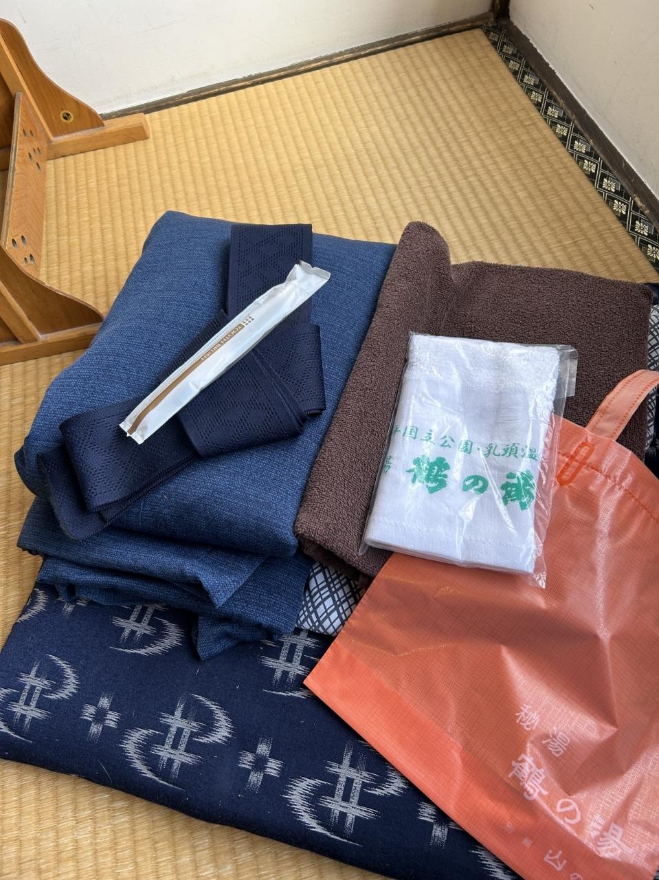 浴衣とベンチコートのような丹前、バスタオルと手拭い、歯ブラシ、ビニールの手提げ袋が用意されています。