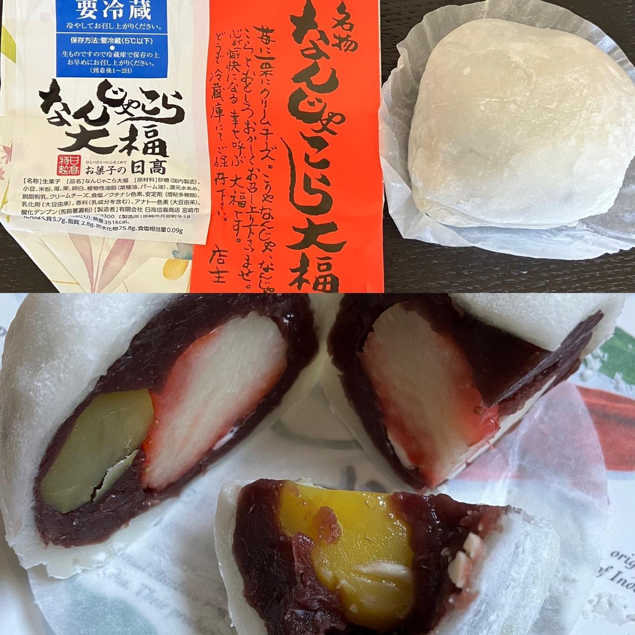 宮崎駅到着後に、夜のオヤツ用として”なんじゃこら大福”を買ってみたけど満腹過ぎて食べれず、期限切れ承知のうえで2日後に自宅で食べたら、色々入っててなんじゃこらだった笑