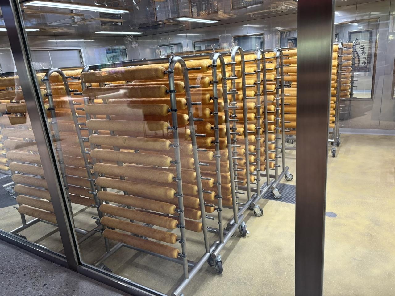ガラス越しにバウムクーヘン作製の様子が見えます。