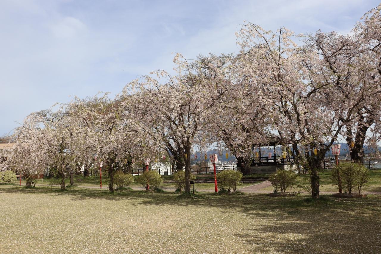 桂城公園のソメイヨシノはだいぶ散っていますが、八重紅枝垂桜は満開