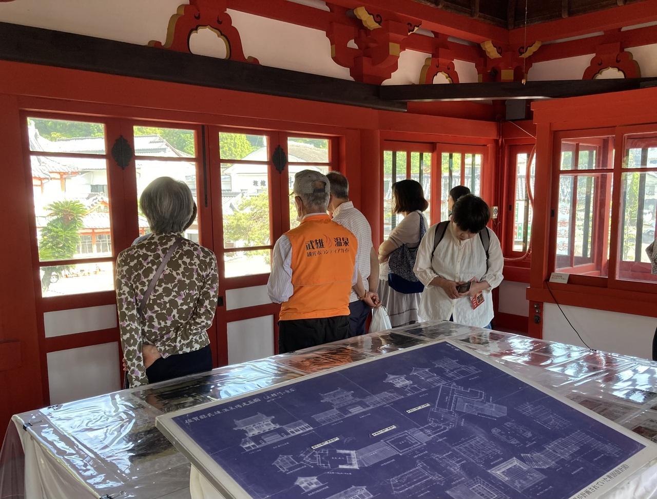 オレンジの服を着た方が説明員で子供の頃の温泉街や楼門復旧のお話をわかりやすくして頂きました。 -