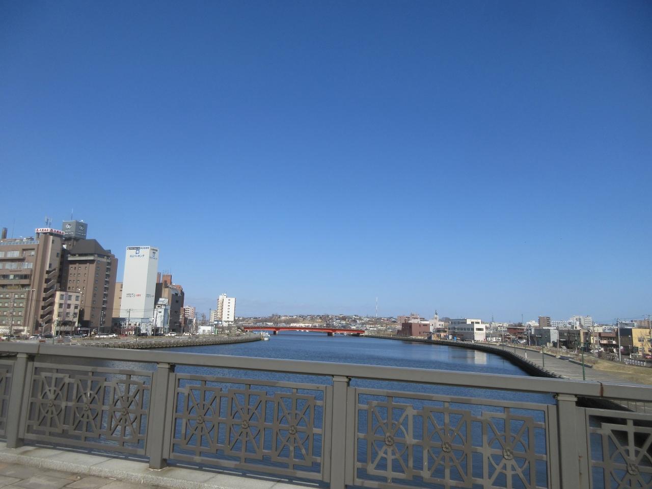 再び幣舞橋を渡って、今度は橋の上から川下側、太平洋の方角を臨みます。