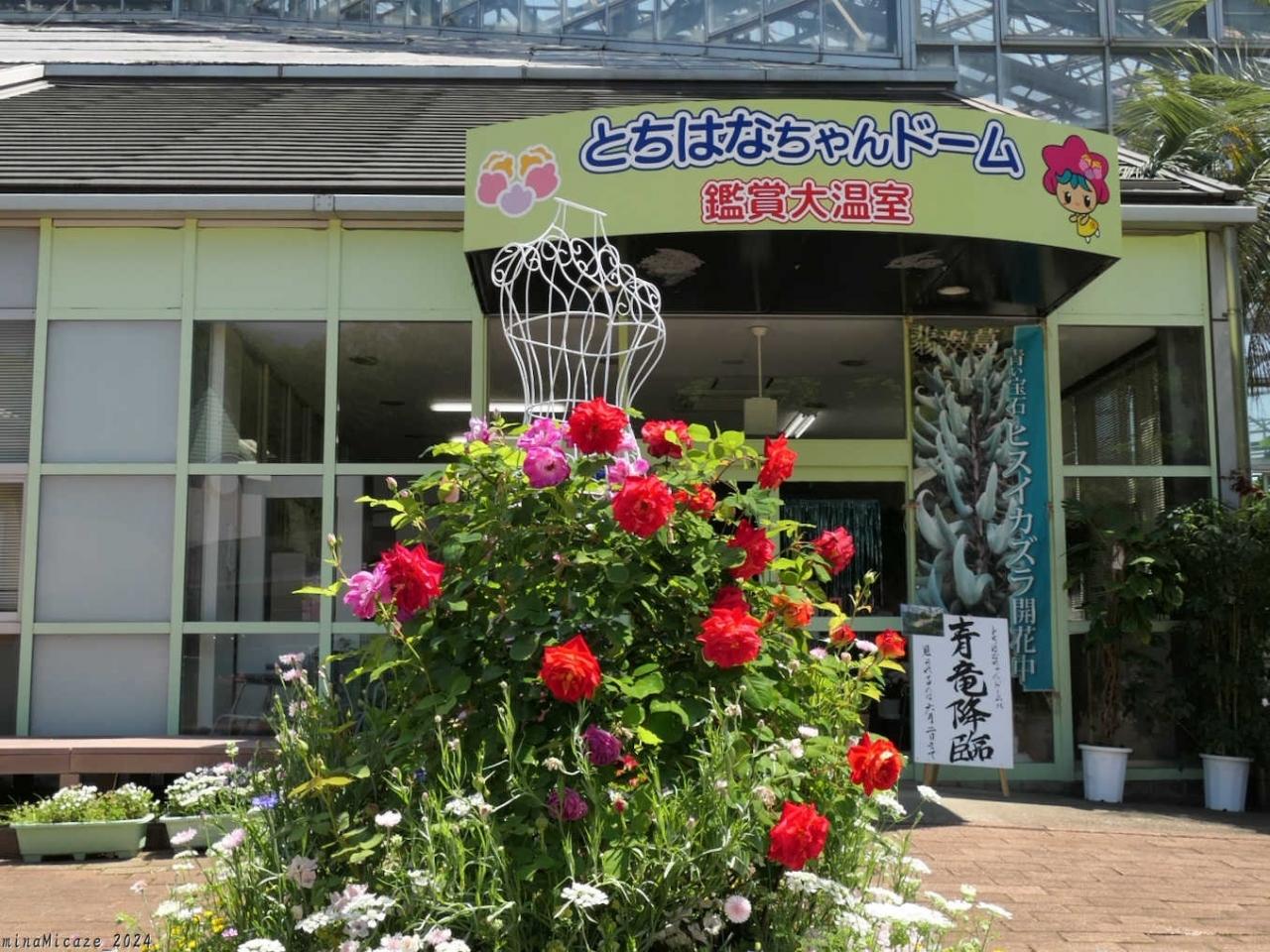 入口の右には、「青い宝石 ヒスイカズラ開花中」および「とち花ちゃんドームに 青竜降臨 見られるのは6月2日まで」と掲出されています。 -