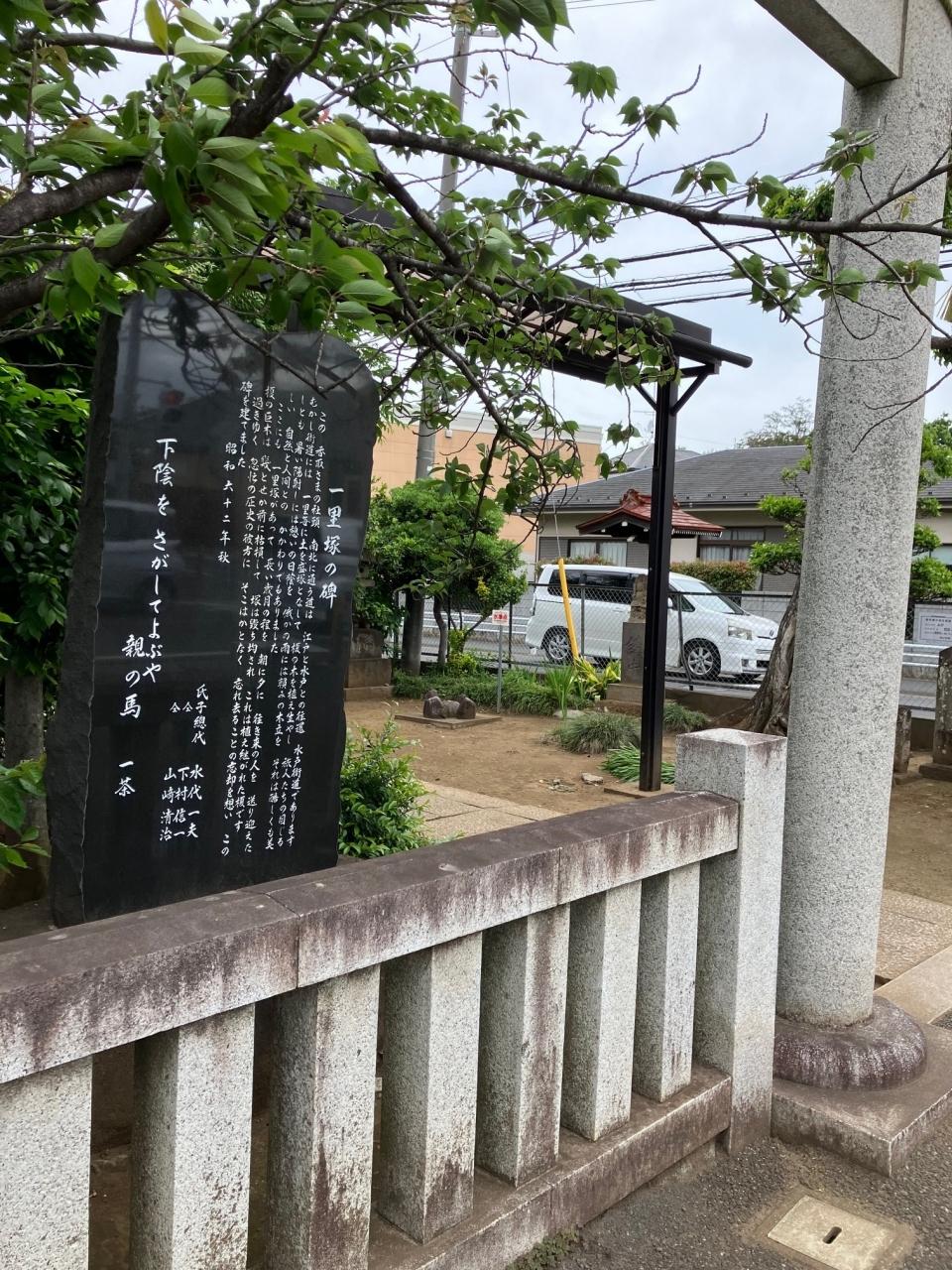香取神社入口の白い鳥居の左手に一里塚の石碑が立っています。 -