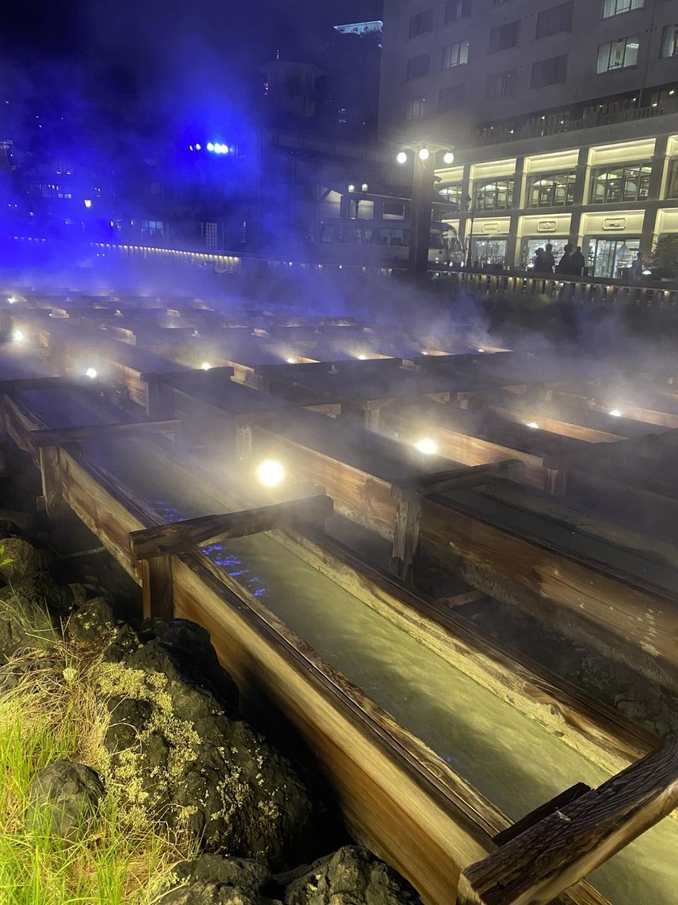 ライトアップされた湯畑が美しい。明るいうちとはまた違った趣で写真映え。