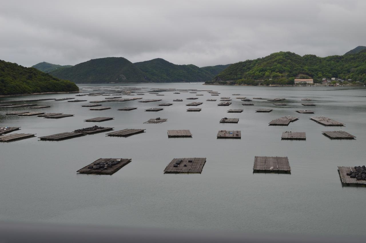 橋から眺めると牡蠣養殖場が船団のように見えました。