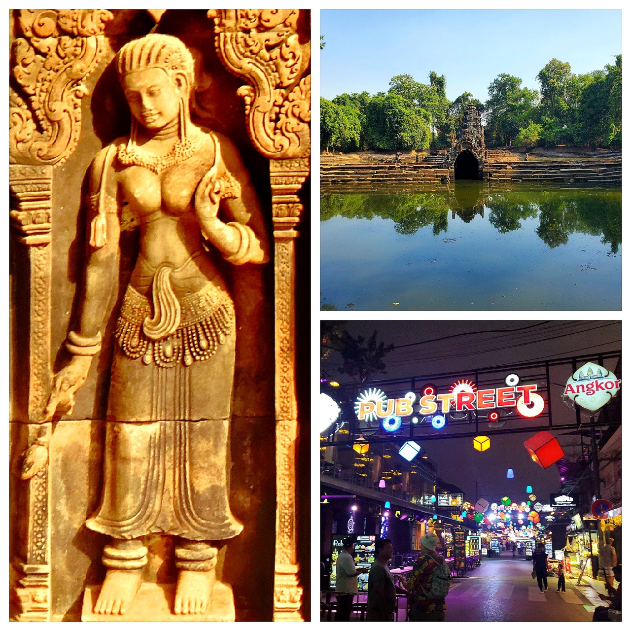 ニャックポアン寺院の水辺と睡蓮の景色。癒されますね。暑い国だからこそ水は貴重。水に映るリフレクションがきれいです。女子大生の言葉からも、カンボジア人の優しい人柄、伝わります。