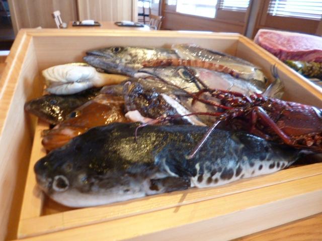 そのあと、レストランに移り、「お好きなものをお好きなだけ・・」と食材を見せてくれました。いろいろおいしそうなものはあるけど、そういわれると・・と、めったに食べられないイセエビや鮑をお造りで食べさせてもらいました。伊勢海老の味噌汁もいただきました。 -