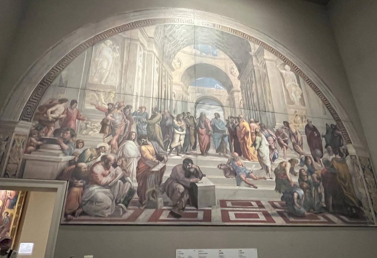 アーチの下に立つ左がプラトン、右がアリストテレス。前者が天を指しているのは彼が精神世界を研究したからで、後者が地を指しているのは、科学を意味しているからだそうな。フーンの世界。 -