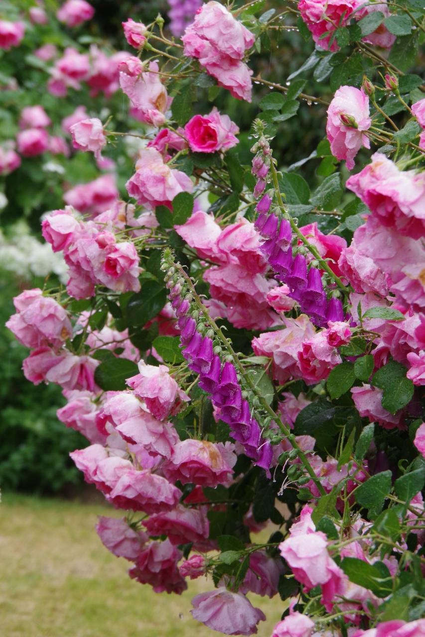 バラのイメージは、キリッと上を向いて誇らしげに咲いている花ですが、茎が細くて長い種類のバラは、雨が続くとうな垂れてしまうようです。あくまでも上を目指すジギタリスと、俯くバラ。そういう対比もいいのでは。