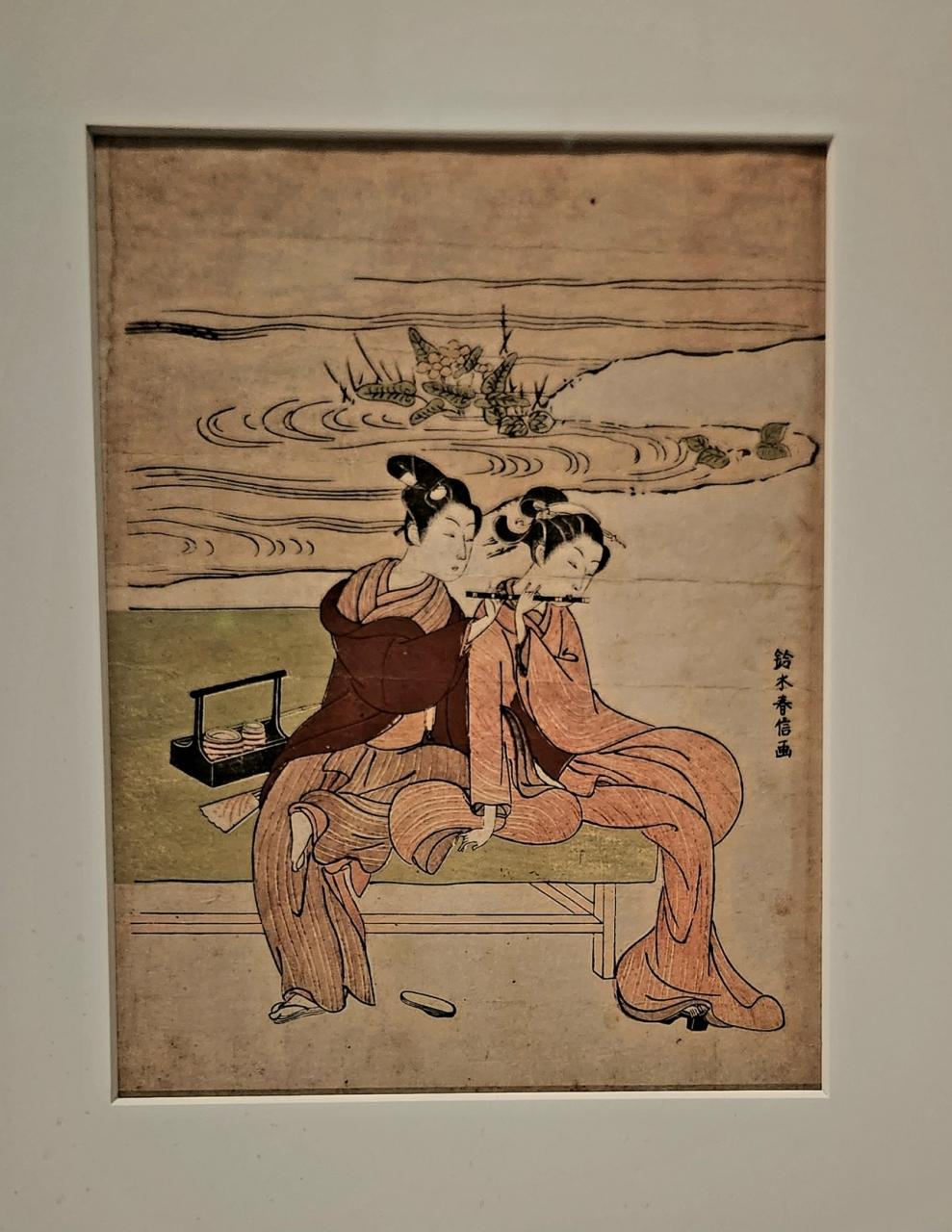 【見立玄宗皇帝・楊貴妃】《鈴木春信》筆 江戸時代18世紀中半(錦絵)川辺で憩う若い男女が身を寄せ合い、一管の笛を共に奏でています。この構図の特徴から本図は江戸の町の恋人たちを唐代の《玄宗皇帝》と《楊貴妃》になぞらえて描いている事がわかります。絵師《春信》の巧みな画面作りを示す作品です。