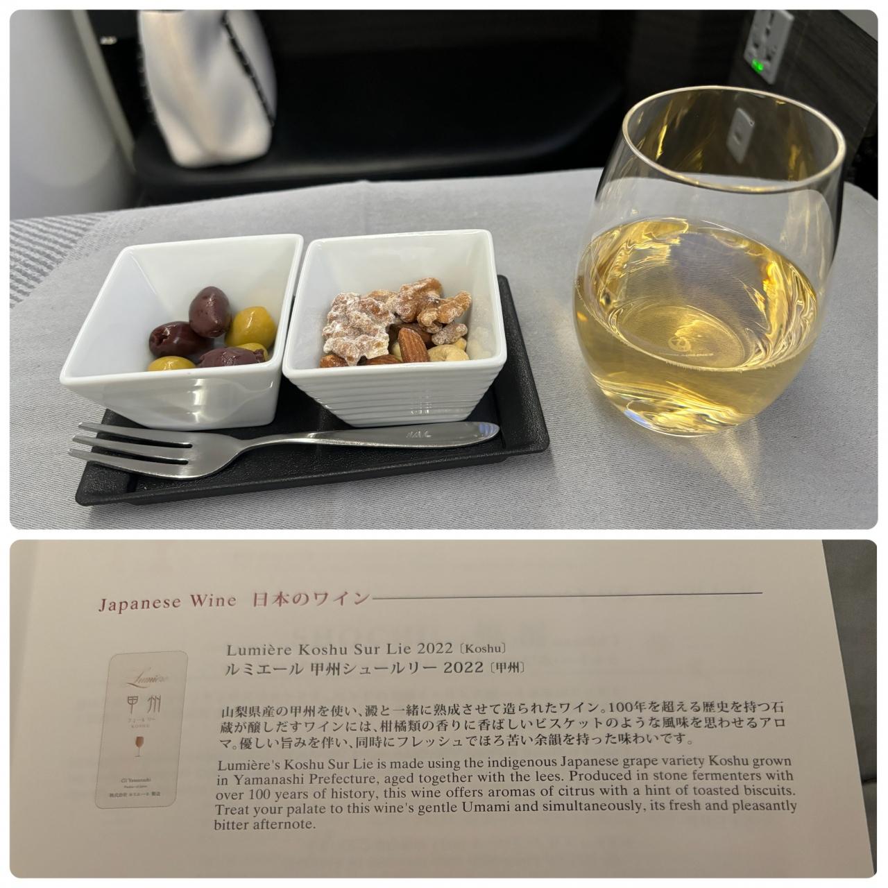 着陸の1時間半前までオーダーできるアラカルトメニューもありましたが、オットもワタシもウェルカムドリンク(シャンパン)をいただいただけで、離陸後すぐに寝てしまいました