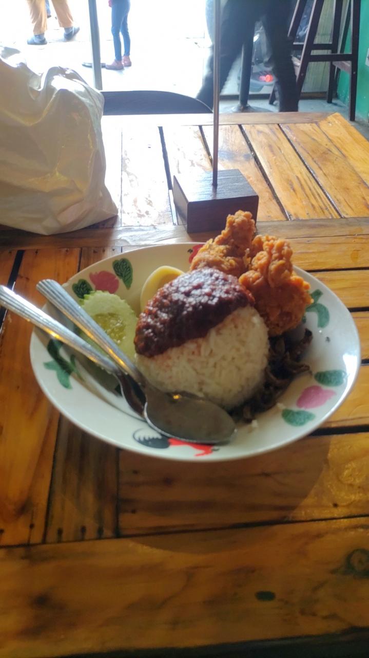 市場のナシレマッが美味しかったのでレストランのもトライ。アヤムゴレンは冷たかったけど、衣カリカリで美味。あと、トッピングされてた煮干しの素揚げみたいな小魚がカリッカリのさくさくでめっちゃ美味しかった! -