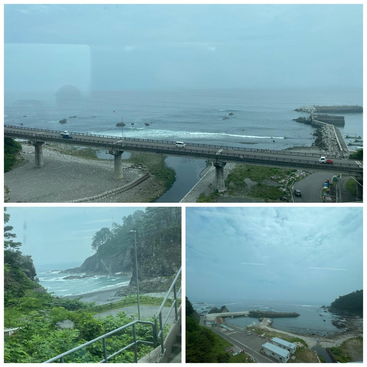 宮古から久慈へ。海側の座席はすぐに埋まってしまいます。所々海が綺麗に見える場所でがありますが、防潮堤がずっと続いて、海は見えません。