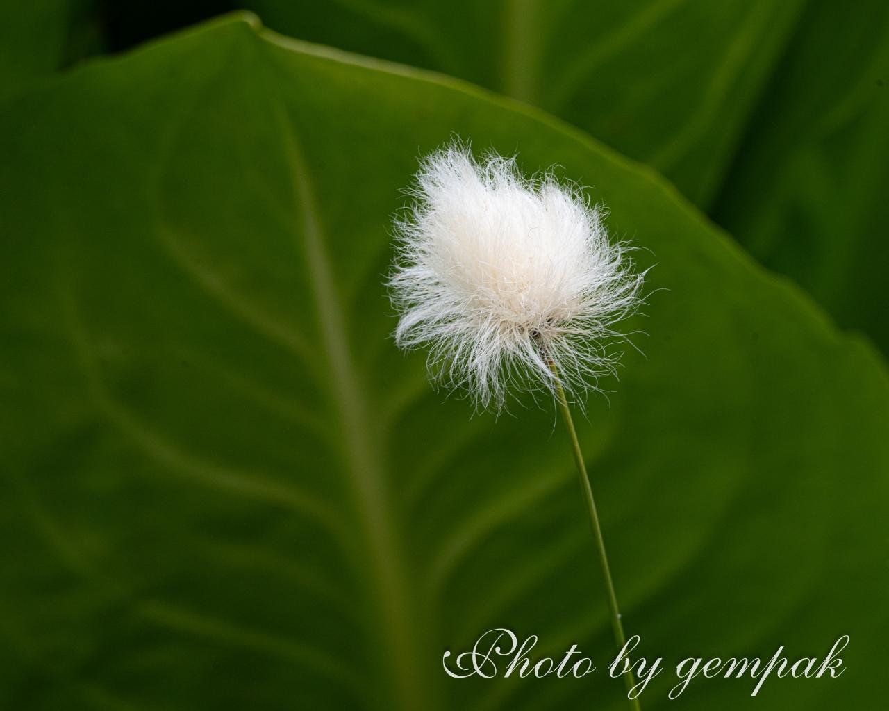 大きく育った水芭蕉の葉をバックにして。
