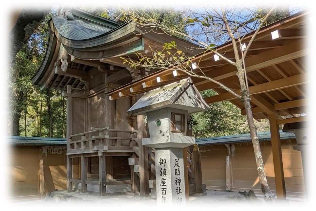 拝殿左側から忠臣足助氏の碑と本殿の眺め