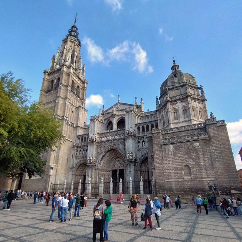 こちら側が正面。幅が59m、奥行きが120mのサンタ・マリア・デ・トレド大聖堂は、スペインカトリックの大本山。13世紀の前半に建設が始まり、260年余りをかけて15世紀末に完成。左の鐘楼の高さは90m。右には礼拝堂のドーム。