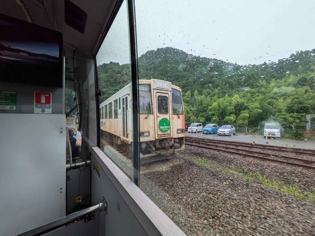 かつての終点の甲浦駅ホームが見えますが通過してその先で一端停車しました