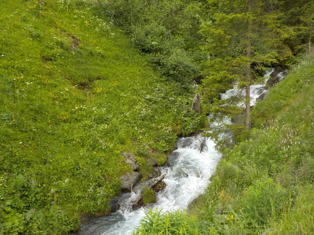 左側は崖になっていて、ミューレンバッハの滝に続く沢があって常に水の流れる音がしています -