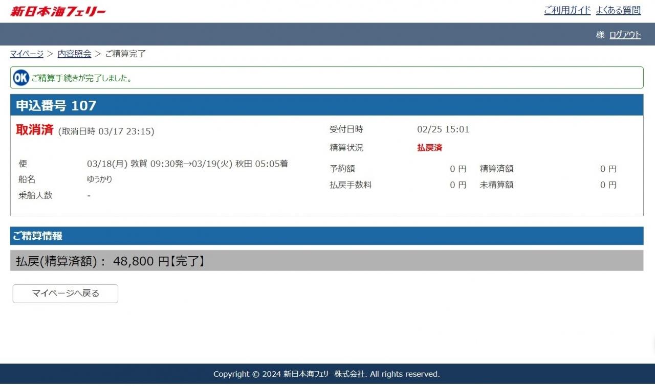 これにてキャンセル・返金手続き完了。
