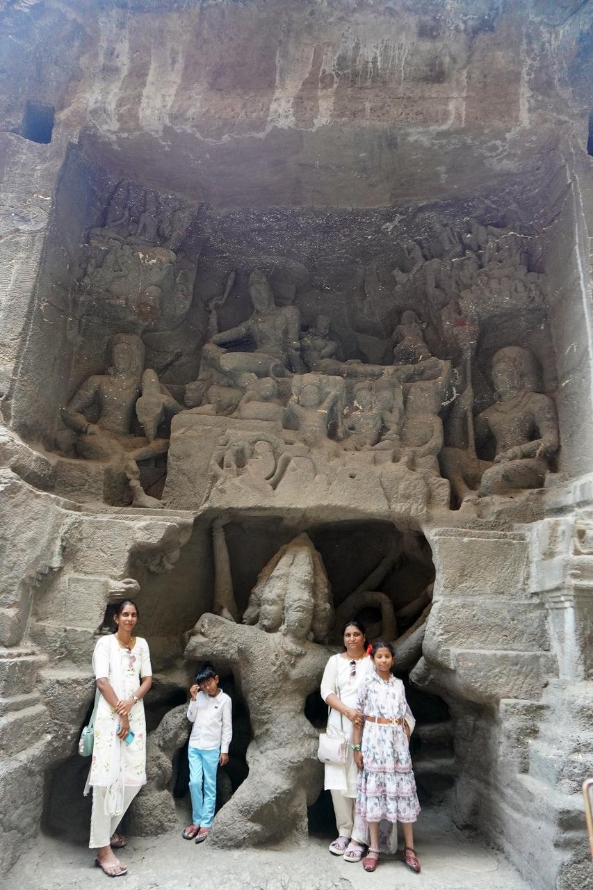 ここまでいくつかのエローラの石窟寺院でも見てきた「シヴァによるラーヴァナへの恩寵」のシーンです。これまでは岩壁に彫られたレリーフのような薄彫りでしたが、ここでは完全に立体彫刻になっていることと、その巨大さに驚きます。