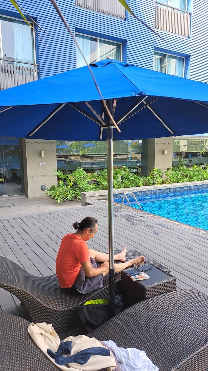 遅い朝食後は、隣接の「ノボテル ジャカルタ マンガ ドゥア スクエア」のプールへ。 -