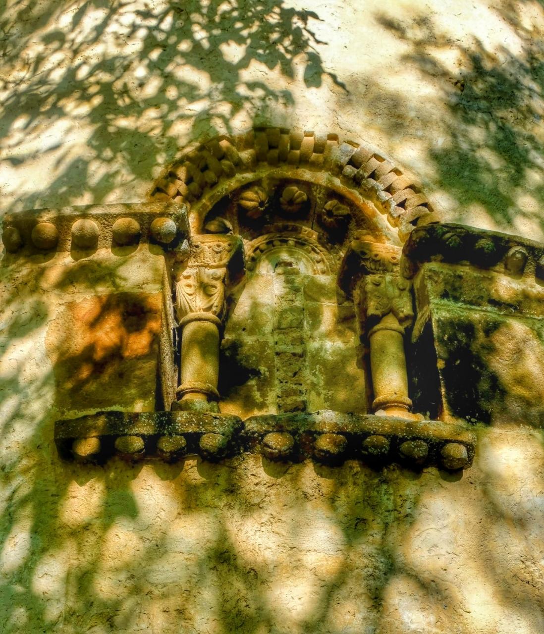 窓枠の明り取りの空間はふさがれてしまっています。左右に残された柱頭は植物文様と動物の頭のようです。この写真では樹木の陰影が強くわかりにくいなっていますがよく見ると上部、下部ともにセメント処理された亀裂が確認できます。