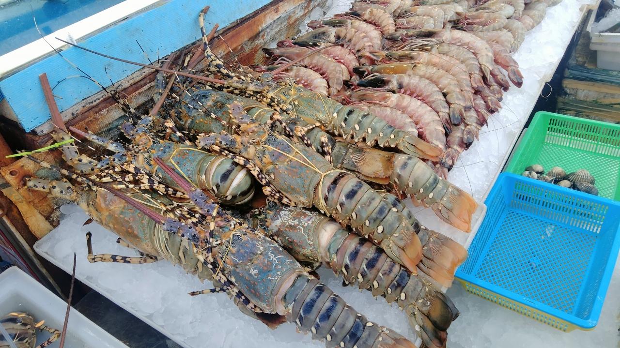 バングラマーケットでは、30cm超の伊勢エビの仲間?が並んでいました。