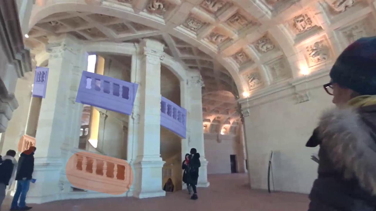 「この階段には、互いに交差する4つの入り口または上り口があり、4人が出会っても、着地するまで小さな抜け穴を通って決して視界に入らないように工夫されています」(2か所だね。)