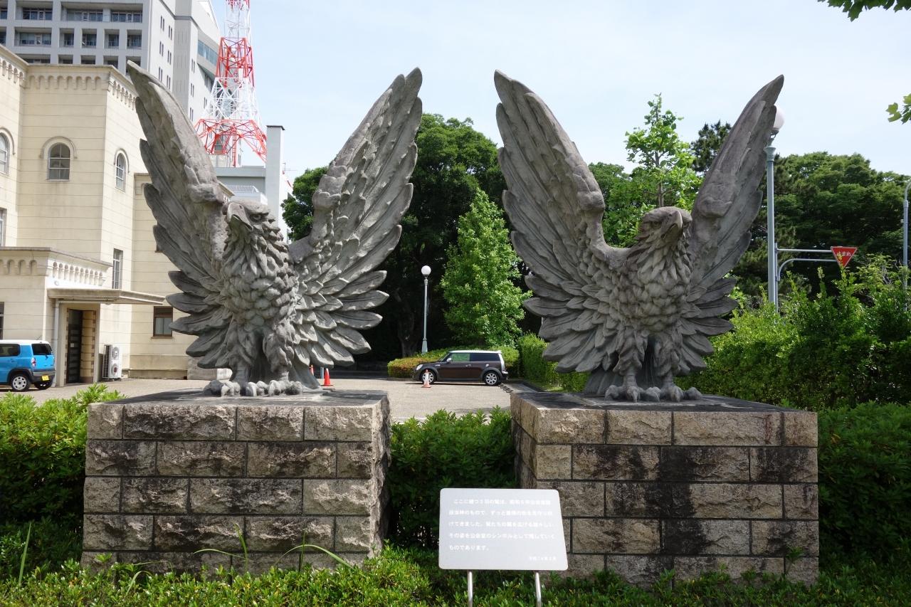 鋭い猛禽類の目つきで雄々しく羽ばたいている2羽の鷲の像。