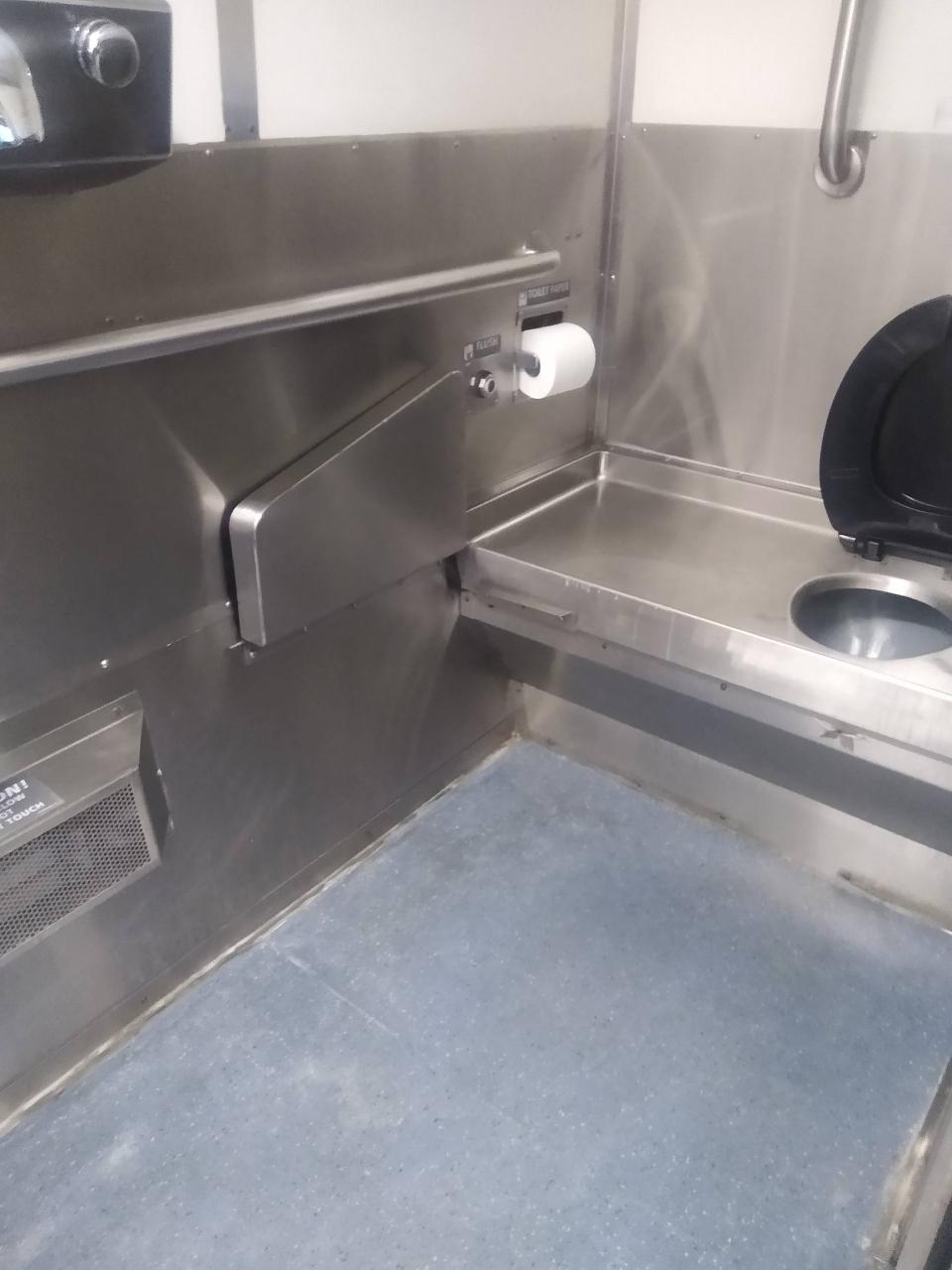 帰りの電車のトイレです。とても広いのと、便器が不思議な形でした。