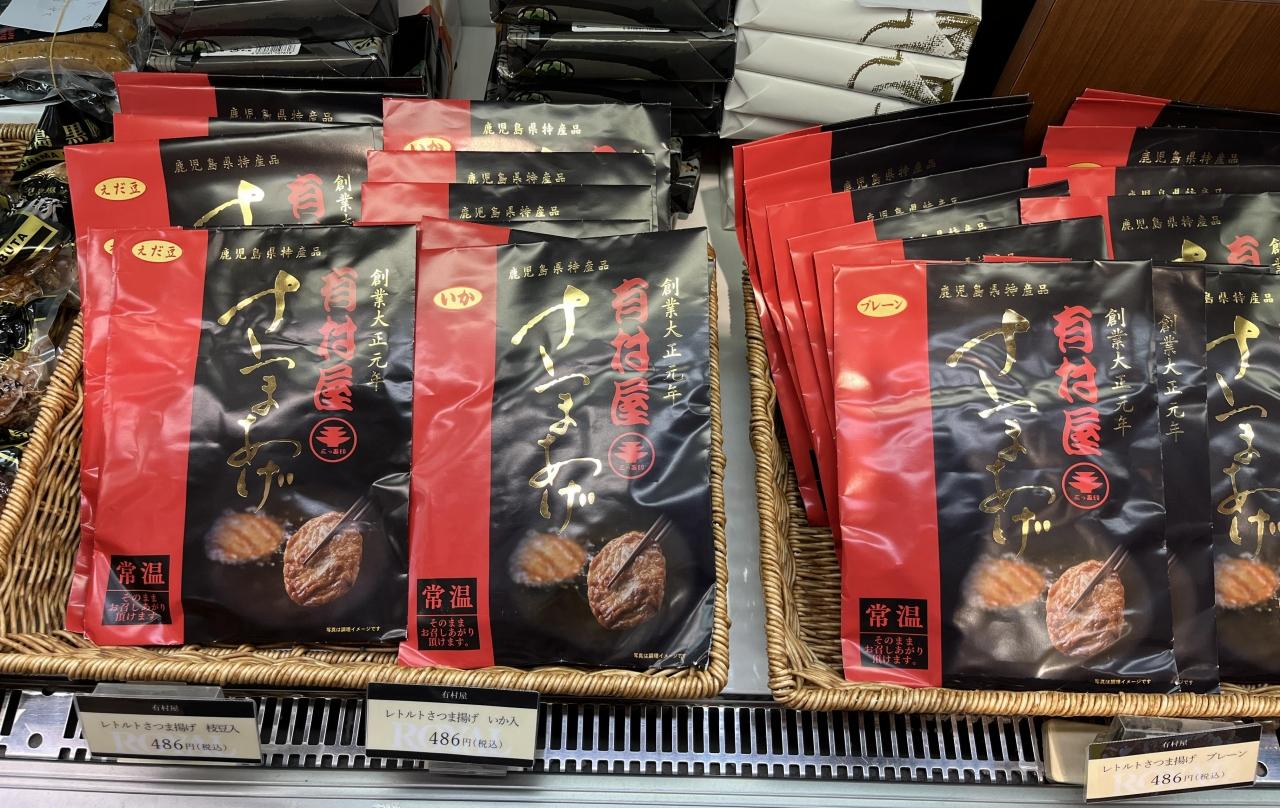 以前山形屋の地階で、地元マダムに、ここ「有村屋」のさつま揚げが美味しいとお聞きしました。常温というのがいいですね。プレーン、えだまめ、486円。