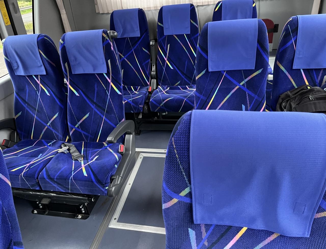 バス後方部分。前の座席との長さが長く、ゆったりとした造りです。座席数は31。一人参加は2席、二人参加は隣同士でした。