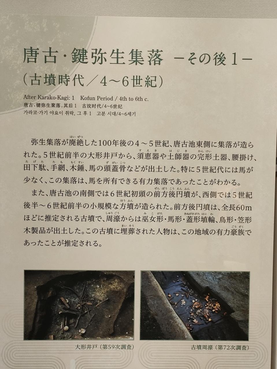 4~5世紀に、この遺跡から馬の頭蓋骨等が出土されており、この時代に馬を所有することができる有力集落であったことは特筆すべきことです。江上波夫さんの「騎馬民族征服説」を支持することはできないとしても、この時代に大量の馬が倭の国に入って来たことは間違いないことです。