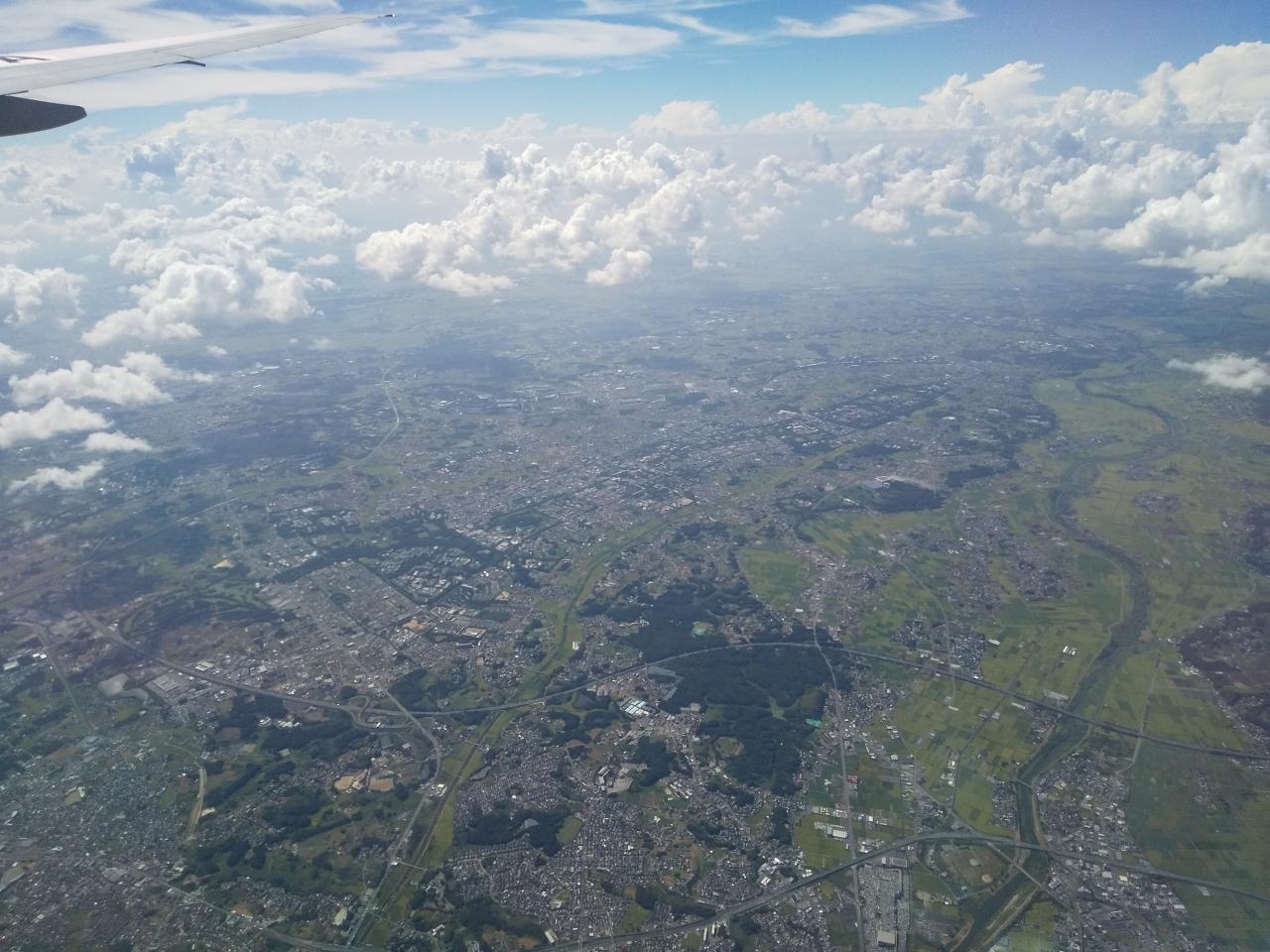 13:53頃、NH554便は、南下を続けてつくば市上空を航行。窓からは桜川の南側に広がる学園都市の様子が分かりました。