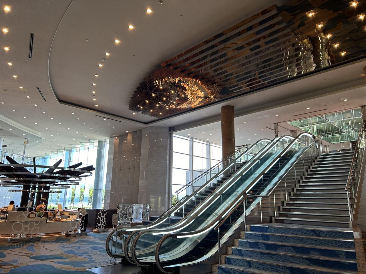 このホテルを設計したのは、有名な建築家・丹下健三氏。地上37階建て、上から見ると半円形になっていて、529の客室はすべて琵琶湖に面しているんだって。