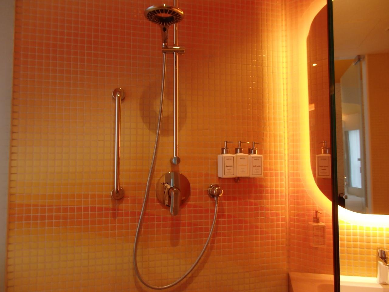 バスルームはシャワーオンリーですが、温度調節しやすく水圧・水捌けも良好。ただ、仕切り板が短いのが難点で、備え付けのボトル入りのヘアーシャンプー・トリートメント・ボディシャンプーがちょっと使いづらい点がありました。