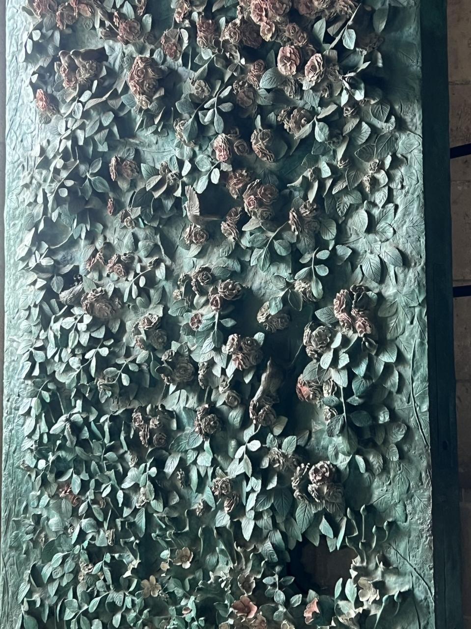 バラの花の彫刻。中に鳥と巣の中のヒナもいるんです。 -