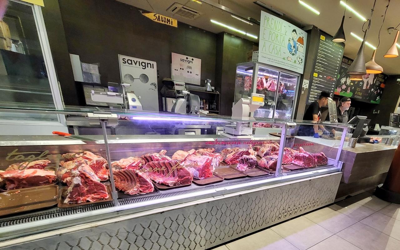 2018年旅行時にランチに利用した2階のフードコートへ。色々なお店を見て回りました。お肉屋さんには、フィレンツェ名物のキアナ牛などが並びます。セントラルマーケット 市場