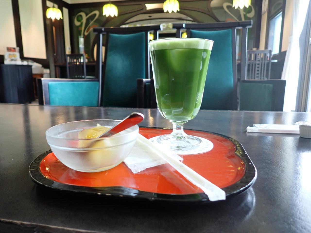 大正時代の建物でうねうねしたガラス越しにお庭を眺め...