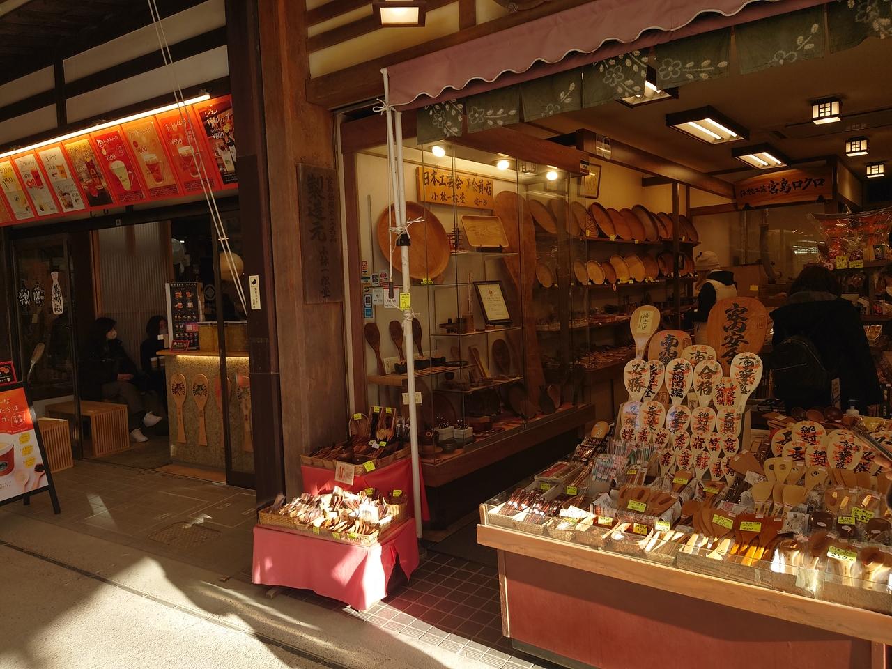 名産品のしゃもじが並んだお店やもみじ饅頭のお店が並びます。
