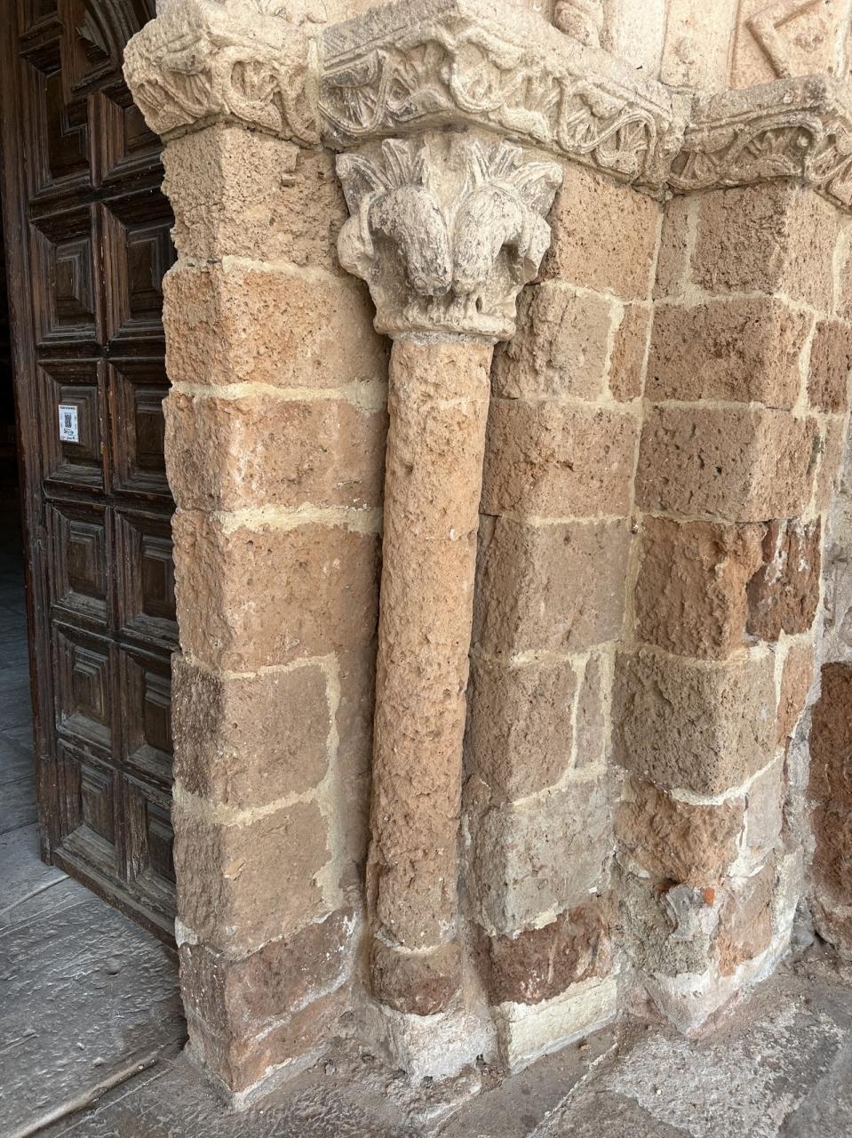 柱廊玄関の横、東側の扉口の柱頭彫刻。狩猟の場面が彫られているとの事ですが摩耗が激しくよくわかりません。
