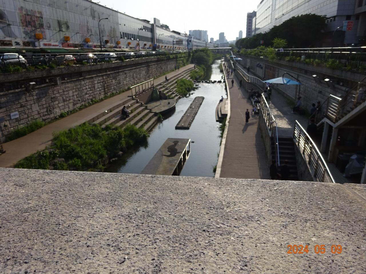 「宗廟(チョンミョ)」の13:40 スタートの日本語無料ツアーに参加したあと、徒歩で宗廟市民公園から広蔵市場にいき、元祖麻薬キムパッのお店でキンパを買って清渓川沿いの遊歩道で食べてみた。美味しくはなかった。
