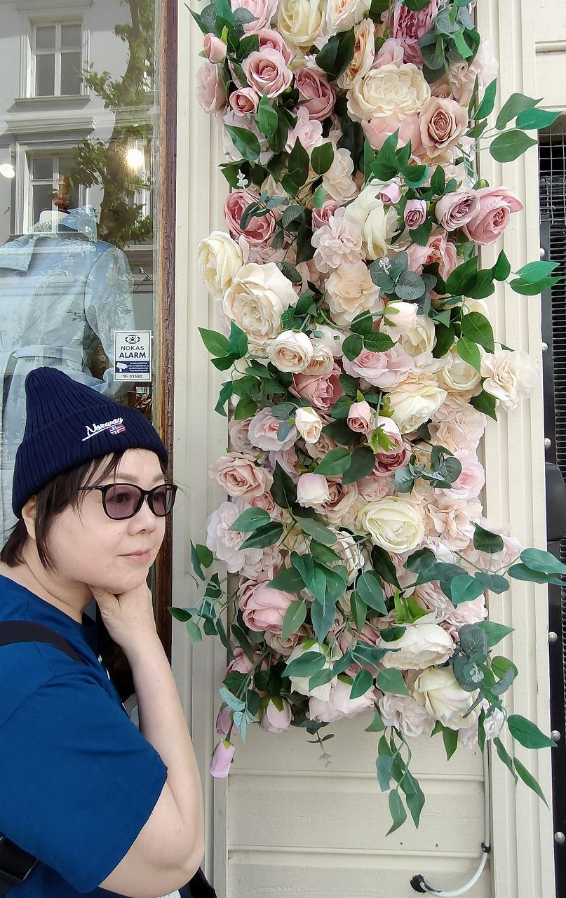 中国系の派手なおばちゃんがこのオブジェと自分を写真に撮ってくれとスマホを渡されてびっくりしました。広場には大きな樽に植えられた花がとてもきれいでした。