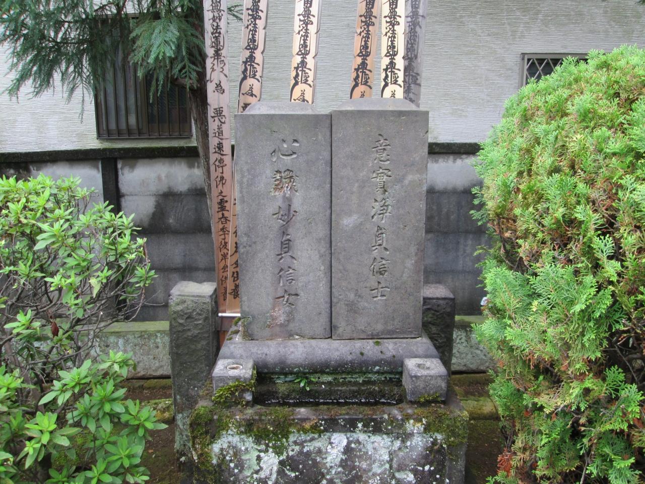 遊女浦里の比翼塚 吉原の遊女三芳野(浦里)と札差伊勢屋の息子伊之助(時次郎)の比翼塚(心中をした男女の墓)です