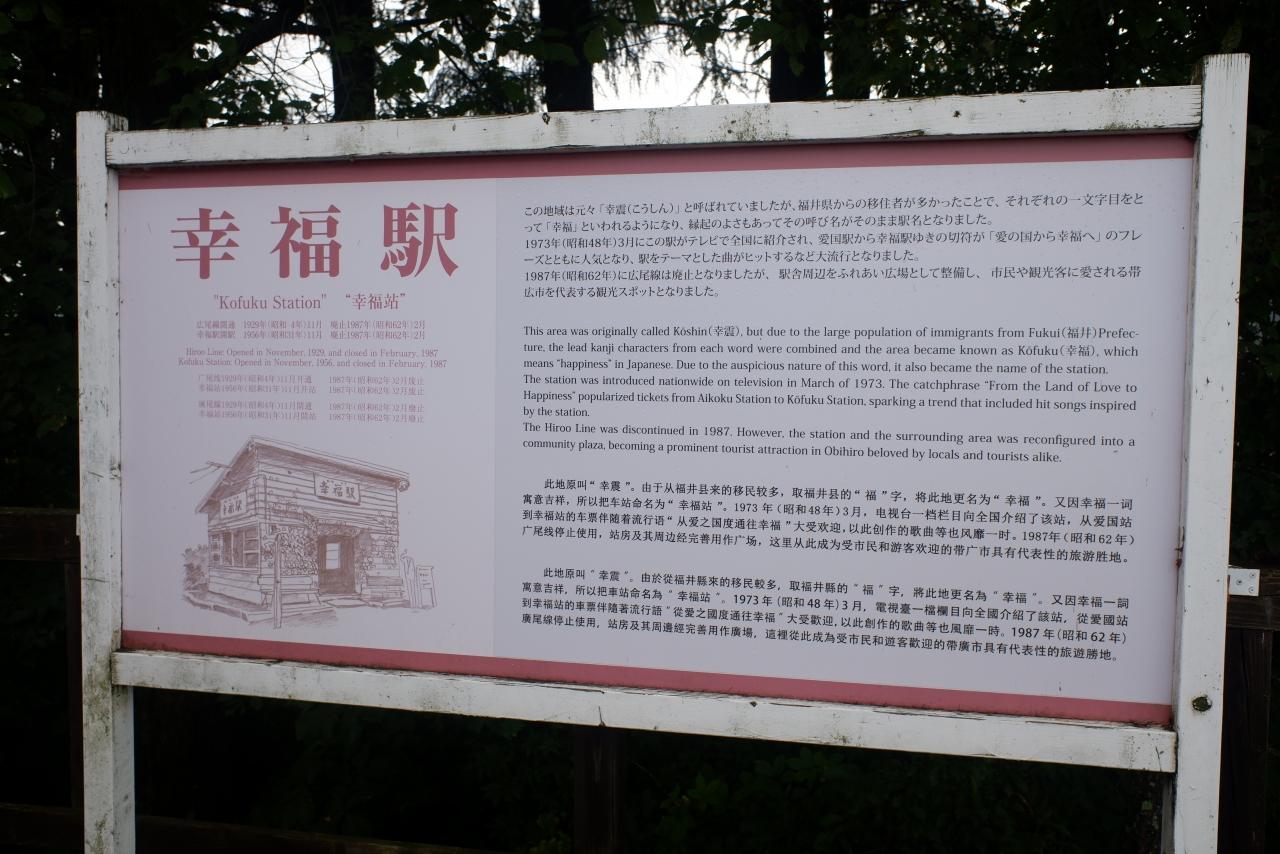 広尾線自体は1932年に帯広~広尾が全通します。幸福駅は戦後の1956年に開業。元々一帯は幸震村であったが、福井県人の入植が多かった土地であること、また「将来の幸福を願う意味もあって」、「幸福」の地名が生まれたらしいです。福井県も幸福の地名誕生にかかわっているという事ですね。