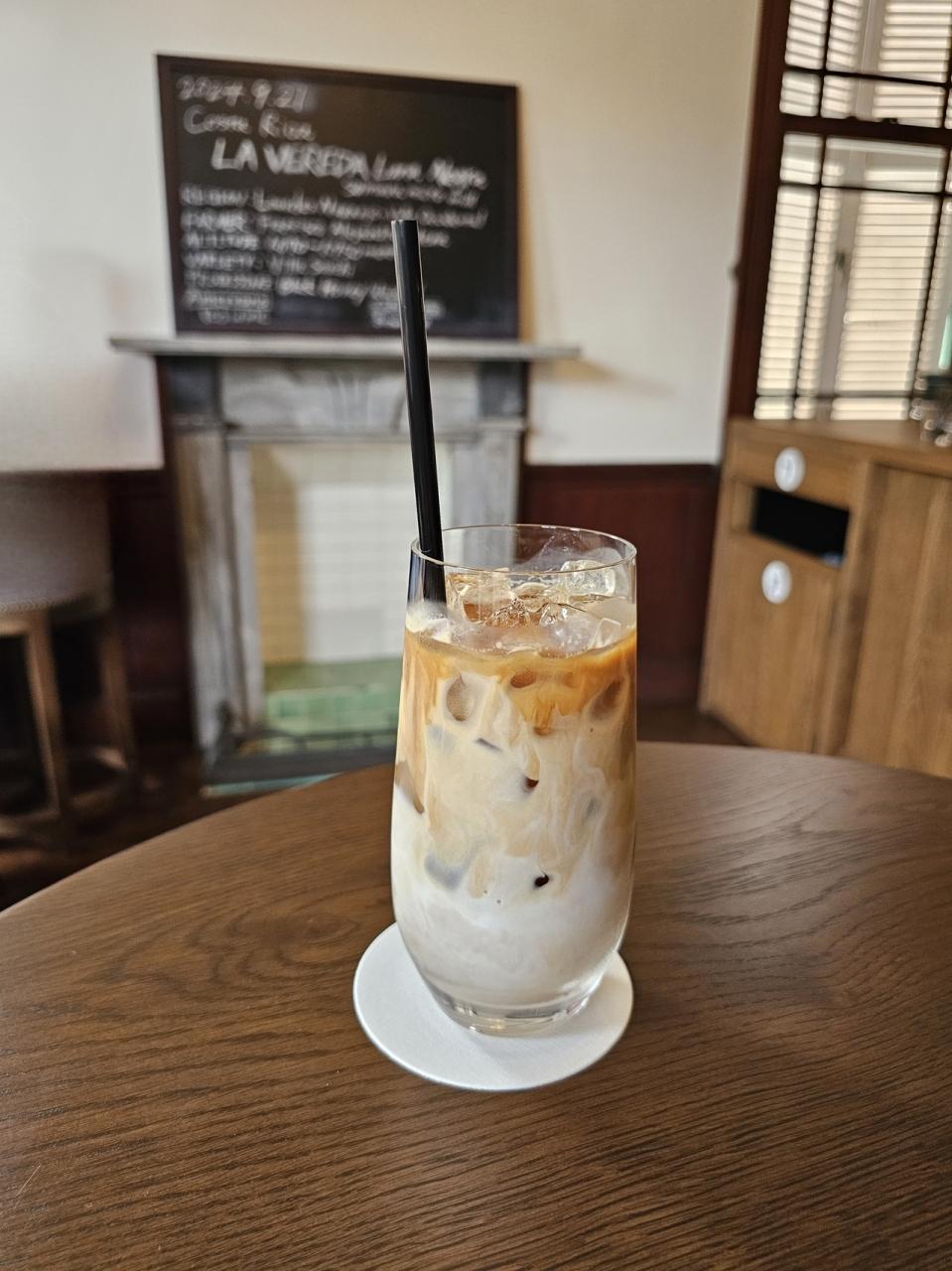 喫茶はホントは戸外の席なのだけど、暑いので室内席でアイスコーヒーをいただいた。