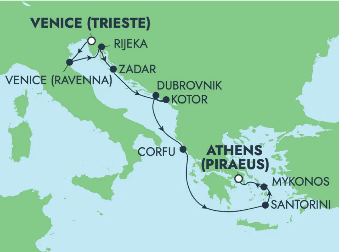 初めての欧州フライ&クルーズは、Trieste, Italy発Piraeus, Greece着のアドリア海/エーゲ海クルーズ9日間。