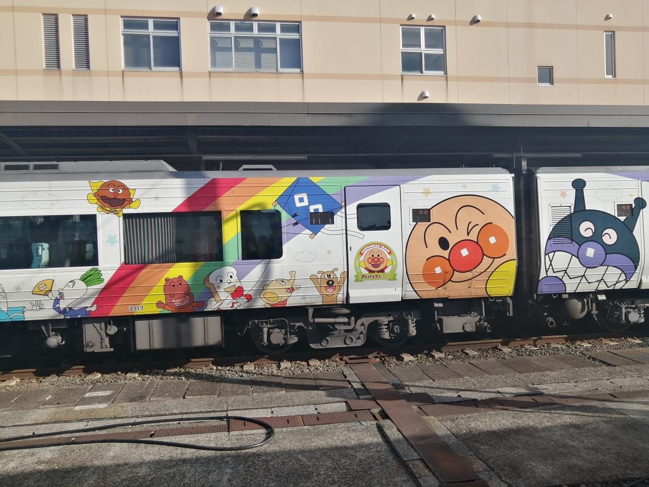アンパンマン列車が停車していました。四国にいると頻繁に見かけますが見るたび楽しい気分になります。